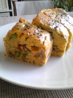 オーブンペーパーを敷いたパウンド型に流し込み、乾燥バジルと粗引きブラックペッパーを表面にトッピング。
